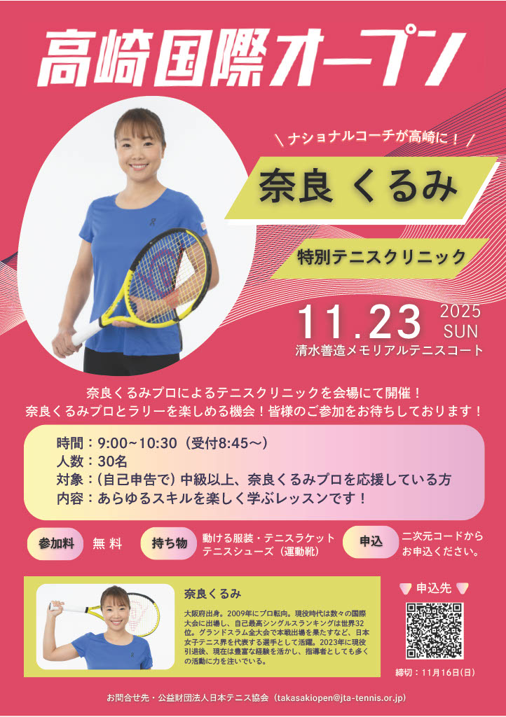 ![]() 11/17~23 善造コートにて 高崎国際オープン開催 入場・観戦無料 チラシ ![]() 11/23 9:00~10:30 奈良くるみプロクリニック チラシ 申込はコチラ ![]() |